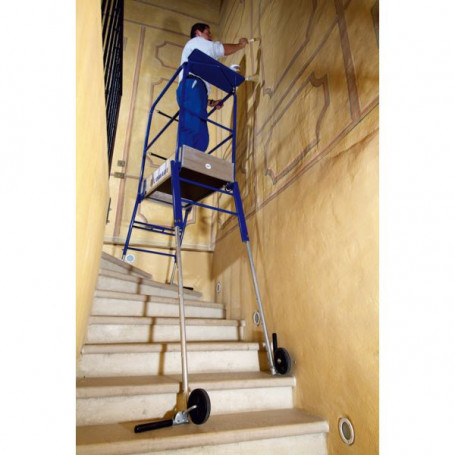 Utilisation sol plat et dénivelé. Plate-forme individuelle de travail en acier. Portillon rigide. Réglage indépendant des 4 pieds pour le travail en escaliers hélicoïdaux (1 m d'amplitude). Plateau 0,50 m x 0,90 m. Roues de déplacement. Hauteur de travail maxi. : 2,68 m Charge maxi. : 150 kg Poids : 30,500 kg Norme : PIRL 93353 - Décret 2004-924