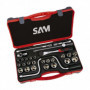 Coffret bimatière. Composé de : - 1 cliquet à inversion centrale, - 1 vilebrequin, - 2 rallonges 125 - 250 mm, - 1 poignée coulissante, - 1 cardan, - 22 douilles 8 - 9 - 10 - 11 - 12 - 13 - 14 - 15 - 16 - 17 - 18 - 19 - 21 - 22 - 23 - 24 - 25 - 26 - 27 - 29 - 30 - 32 mm.