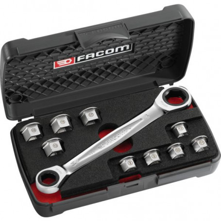 Tête extra plate 3 fois plus fine qu'un système cliquetdouille. Verrouillage et déverrouillage de la bague d'une seule main, pas de risque d'éjection accidentelle. Utilisation cliquet traversant sur filetages longs. Angle de reprise 5°. Dimensions : 8 - 9 - 10 - 11 - 12 - 13 - 14 - 15 - 16 - 17- 19 mm Finition chromé satiné.