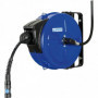 Carter fermé acier revêtement epoxy. Blocage du tuyau par cliquet d'arrêt. Tuyau polyuréthane avec raccord rapide de sécurité mono impulsion. Pivote sur 180°. Butée réglable. Support mural acier. Longueur : 10 m Diamètre tuyau : 8 x 12 mm Pression d'air maxi. : 12 bar Poids : 8 kg Dimensions : 35 x 28 cm