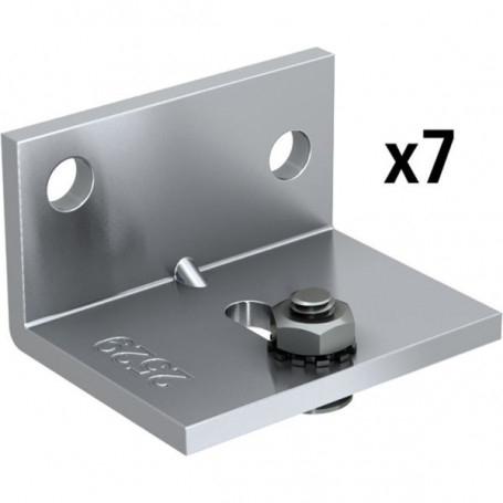 Lot de 7 équerres pour fixation murale du rail CADETTE 2525. Hauteur : 23 mm Longueur : 30 mm Épaisseur : 3 mm Livré avec vis, écrous et rondelles.