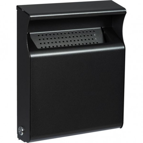 En acier électro-zingué poudré polyester gris manganèse (intérieur et extérieur), fixation murale en 4 points et tôle renforcée. Fermeture par clé triangulaire. Protection contre les intempéries. Vidage simple par décrochage et retournement du bac. Autocollant cigarette fourni.